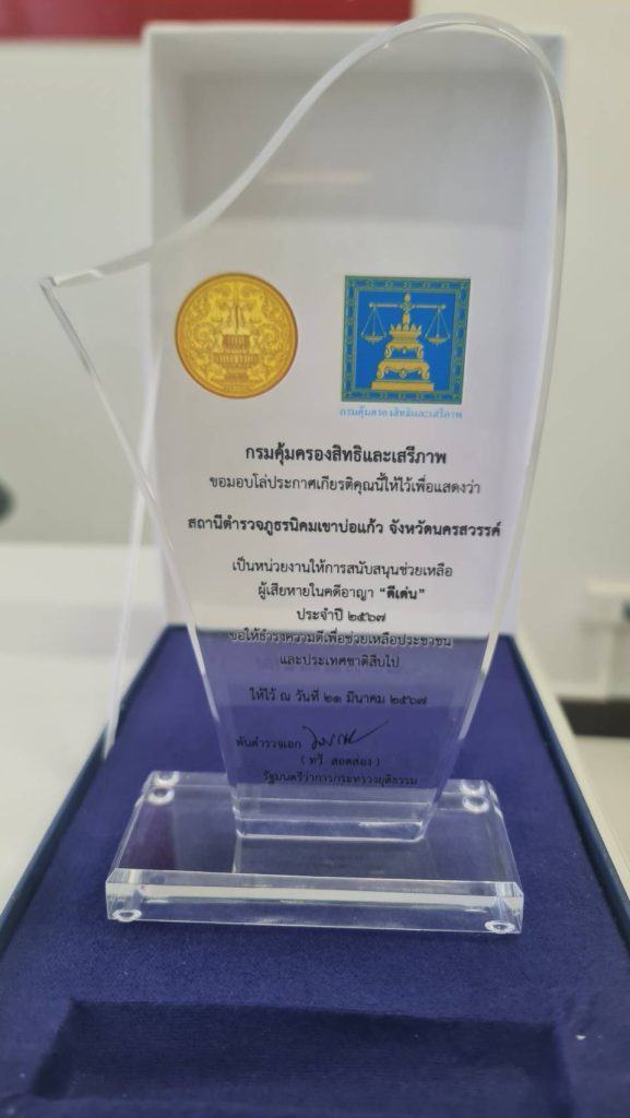 และได้รับโล่เกียรติคุณ ดีเด่น ในการขับเคลื่อนงานแจ้งสิทธิและรับคำขอช่วยเหลือเยียวยาผู้เสียหายในคดีอาญา จาก พ.ต.อ.ทวี สอดส่อง รัฐมนตรีว่าการกระทรวงยุติธรรม